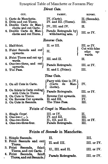 Burton then gives what he refers to as a synoptical table of Manchette or Forearm play, showing the Cuts, the Guards (Parries) for the Cuts, and the Ripostes or replies that should follow each Parade.