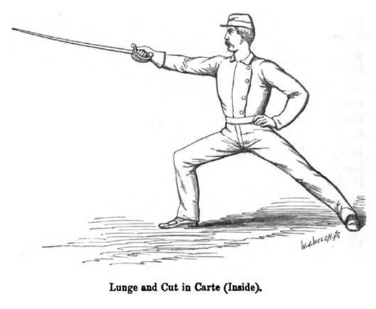 - The Whip Cut; in which the arm and elbow are kept almost motionless, and the blow is delivered from the wrist. This is the principal Cut allowed in my system; it is capable of sufficient effect upon the opponent whilst it does not uncover the swordsman who uses it.
