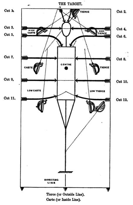 Burton’s target is oblong and the figure is five foot 8 inches tall. Showing the lines of the 12 cuts and the angle of the saber. He notes that the target “directs the recruit on how to make the cuts, but not exactly where; this must depend upon how the opponent acts during the attack and the defense.”