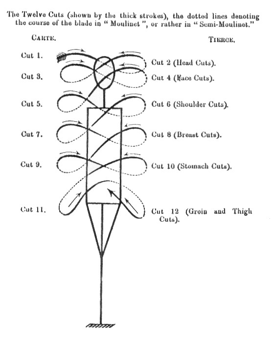 There are twelve cuts. 1 & 2 are at the head, 3 & 4 are horizontal face cuts, 5 & 6 are slanting shoulder cuts, 7 & 8 are horizontal breast cuts, 9& 10 are horizontal stomach cuts, and 11 & 12 are slanting groin or thigh cuts, going from downwards upwards, as in the reverse of the shoulder cuts.