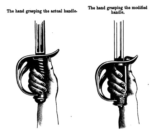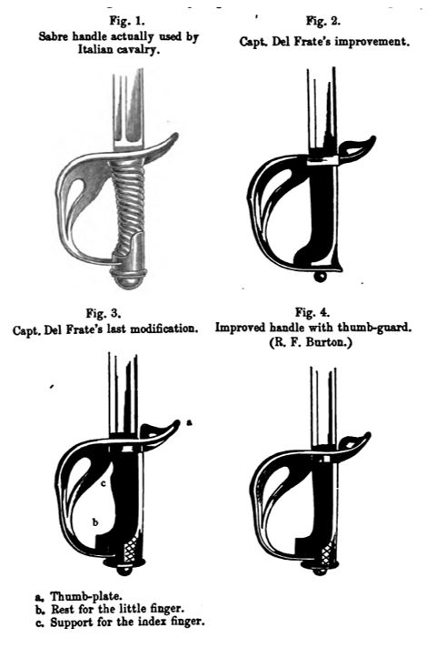 An Appendix to the Sword Exercises alludes to an improved form of sabre handle. Burton recommends a modified grip made by the Italian Captain Settimo del Frate. This is illustrated in the following diagrams