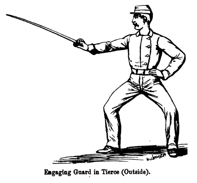 He recommends that the right-handed recruit be taught the engaging guard of tierce, with the opponent’s blade in the outer line. The reverse position leaves the fore-arm unguarded, and tierce facilitates the defense of the low lines.
