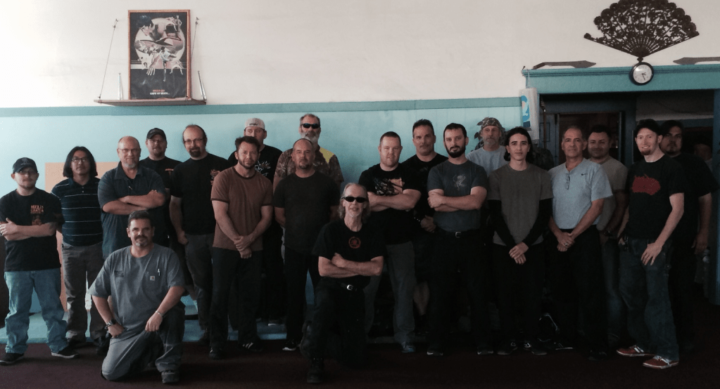 His studio in Milton Freewater, Oregon is on the second floor of a brick building from the 1900s. The door at the top of the stairs to the training hall is hard-sprung, a waiting trap for the unaware: reminding us of the dangers of transitions (limen). Immediately past the door is a counter with a bucket of Stingers and his original karate dojo sign sits half-hidden in the corner. Passing into the studio proper, the floor has threadbare red carpet (to hide the blood) and training tools line the walls: Blunted machetes next to foil daggers and fencing masks, Escrima sticks in the corner, crossed sabers on the wall. A dragon-hilted daisho set sits on an elevated shelf above an abandoned brick plinth for a long-removed wood stove. A shrine to Bruce Lee is on the dominant wall. This is a place of serious training.