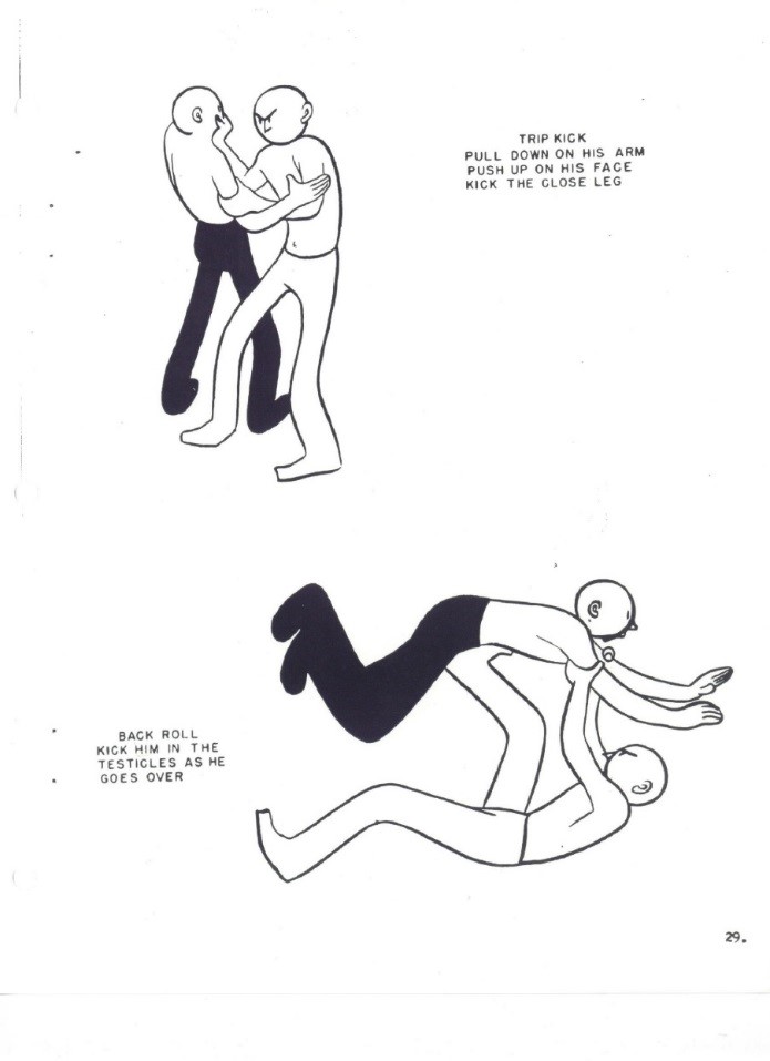 I purposefully selected those techniques that were somewhat amusing – but if you compare these with general combative manuals you will find the same techniques. These are from “Dirty Fighting” by Lt. David Morrah Jr. (1945). [2]