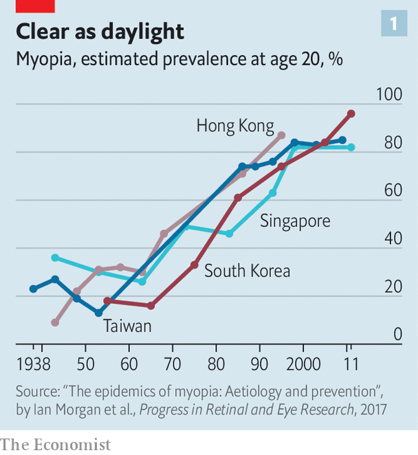 [1] In the early 1980s Taiwan’s army realized it had a problem. More and more of its conscripts seemed to be short-sighted, meaning they needed glasses to focus on distant objects. “They were worried that if the worst happened [ie, an attack by China] their troops would be fighting at a disadvantage,” says Ian Morgan, who studies myopia at Australian National University, in Canberra. An island-wide study in 1983 confirmed that around 70% of Taiwanese school leavers needed glasses or contact lenses to see properly.