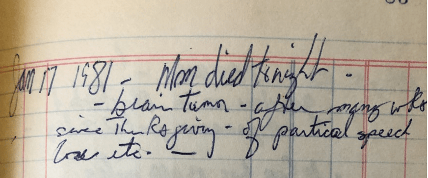My father was 35 when his mother died January 17, 1981 which he noted Laconically in his journal. I was 13 and remember well my grandmother’s aphasia. I remember sitting with her and my parents having a conversation. My mother was very adept at interpreting what my grandmother was trying to say even though the words had no connection to the intended referent. I recall being frustrated and my frustration clearly showed my grandmother – a life long teacher – that she could not be understood. Part of me remains convinced that was a catalyst for her death – how could she not be understood?