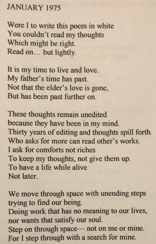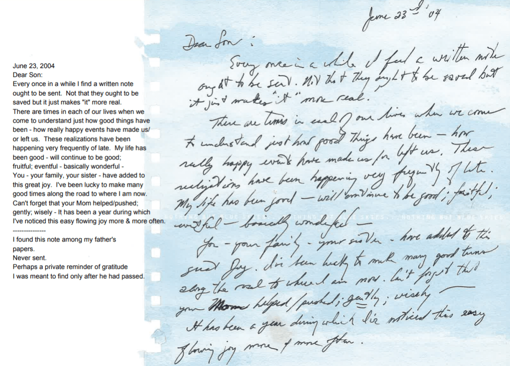 I returned for his funeral. The first night I poured a stiff drink and went through the financial and medical bills that had accumulated. After the funeral I spent a few days going through his papers, mostly research on the Civil War, old family journals, and then, his own. Among them I found a letter he had written me but never sent.