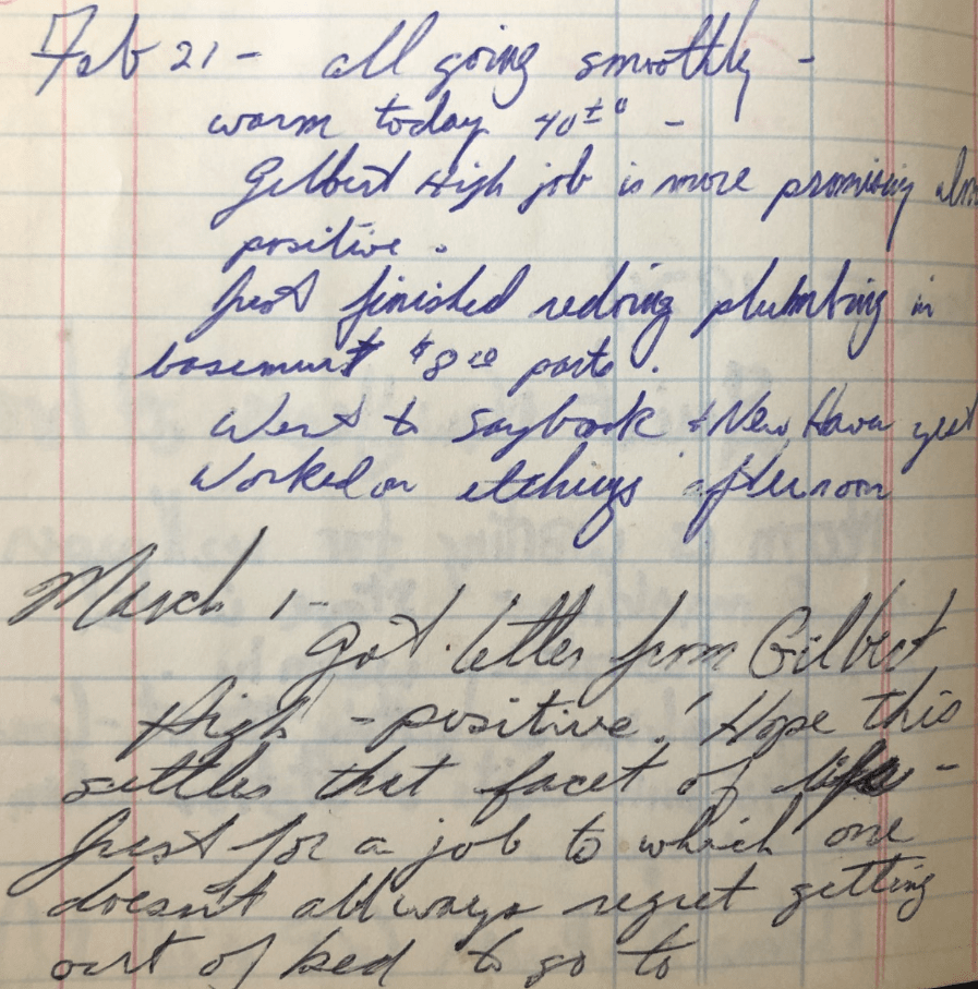 March 1, 1974. “Got letter from Gilbert High – positive! Hope this settles that facet of life – Just for a job to which one doesn’t always regret getting out of bed to go to.