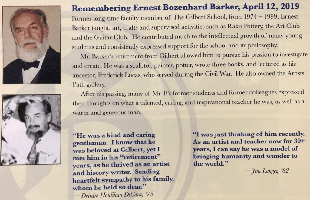 Ernie taught art at Winsted’s Gilbert School, where he was known as “Mr. B” for more than 25 years until his retirement in 2000. Retirement allowed him to pursue his passion to investigate and create. He was a sculptor, painter, potter, wrote three books and owned the Artists’ Path gallery.