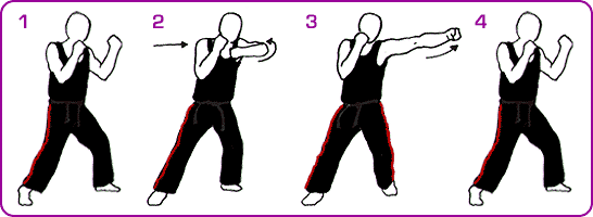 - Vertical – From the back fist, drop your elbow straight down deep into the hip and explode up with a punch that finishes palm down (your punch from the hip begins palm up). Raise the right arm to shield the side of your head.