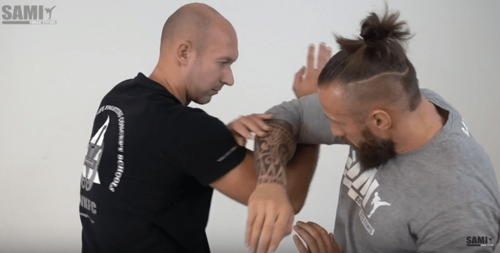 - Horizontal – The movement is palm parallel to the ground, the elbow is also parallel to the ground and travels from the shoulder to sternum. The strike is then a back fist the nose.