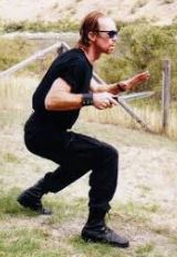 The draw is a quick response to an assailant. The fixed blade is open carry in a sheath (Oregon Knife Up law) with the blade pointed to the rear. Once you establish a master grip on the handle the knife is quickly presented in a edge-in (the “pakal”) grip. There are two primary grips, forward and reverse. Then there are two blade orientations, edge in and edge out. Together these are the 4 edges of the blade. The edge-in grip is dictated by the logic of the system. As Master Keating will readily admit, the grip is not a panacea, the grip is dictated by the logic of the system which is a close quarters extreme protection scenario. It is not a duel or a contest of styles. Drawpoint is a trained response to a surprise and violent assault.[2]