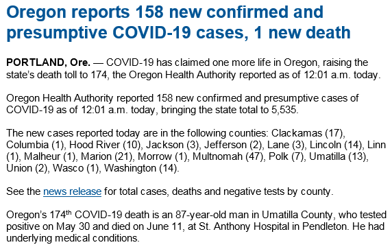 With the received wisdom of the natural order, I submit that the continued sequestering in Oregon is nonsense. The official posting for today (6/13/2020):