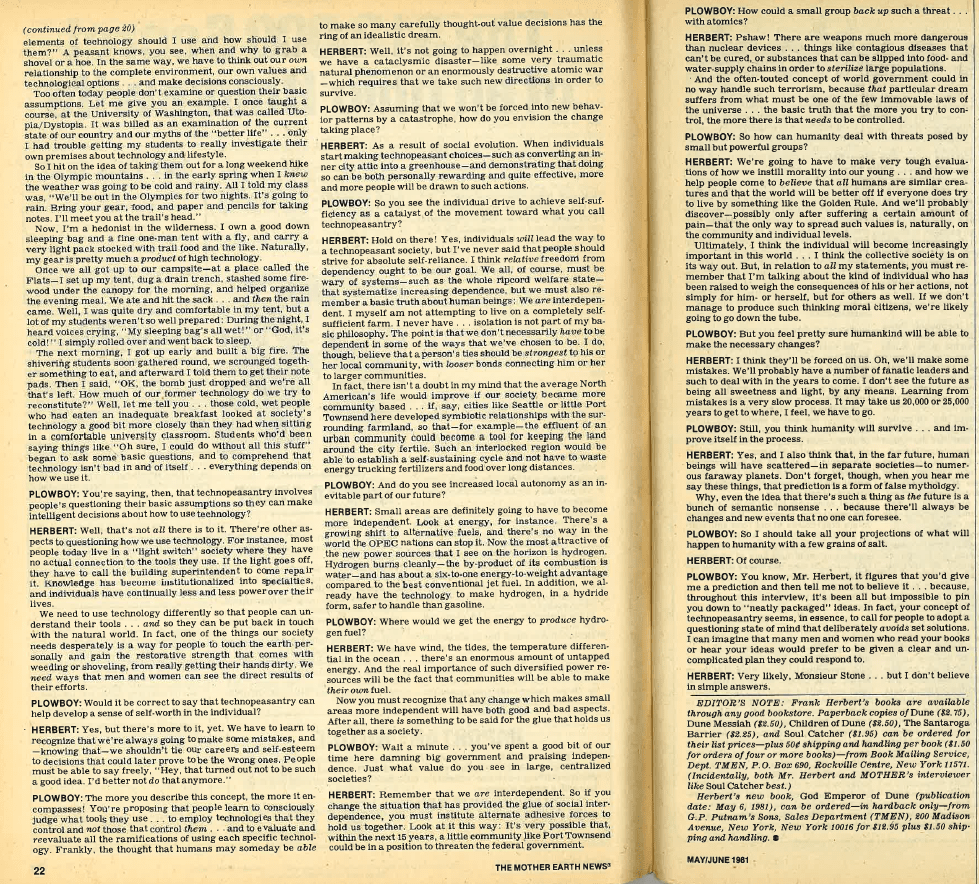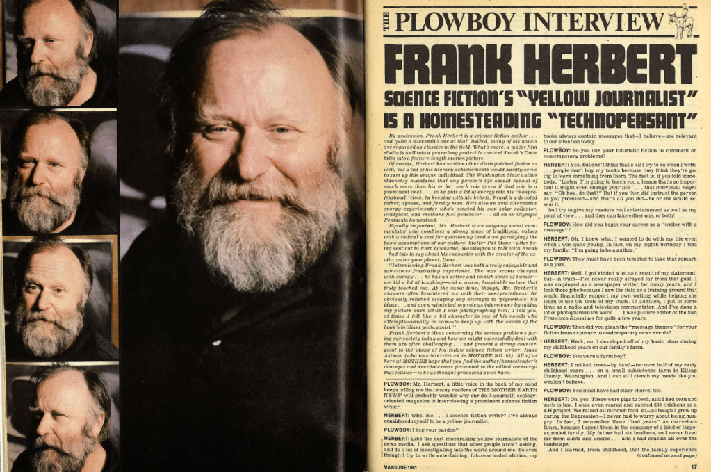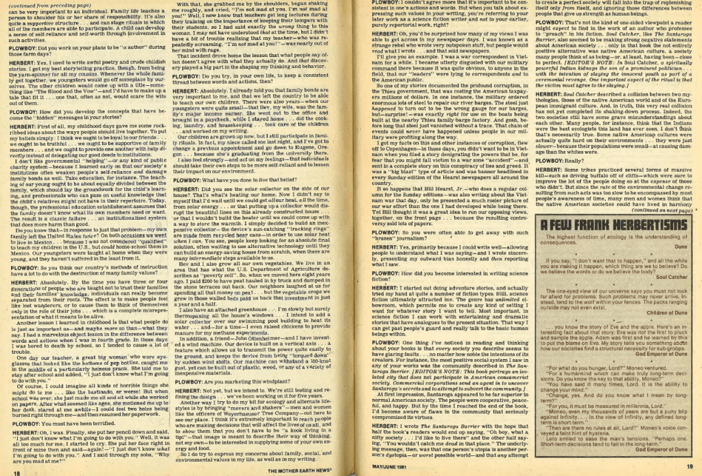 Below are images from Mother Earth News, #69, May/June 1981 – an interview with Frank Herbert.