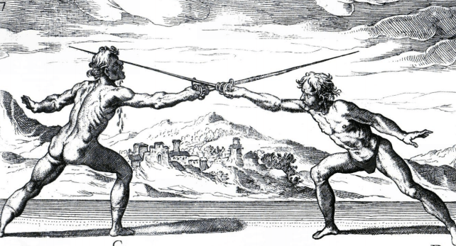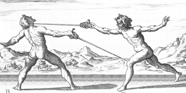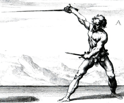 Capo Ferro traces the evolution of his art from a simple club through the Roman era to show the primacy of his system. He considers the ideal length of a weapon to be from the sole of the foot to the underside of the armpit; “All weapons which differ from this distance of natural offense and defense are most bestial, very adverse to nature, and therefore useless to civil conversation.”[3] Thus concludes his introduction to Italian Rapier.