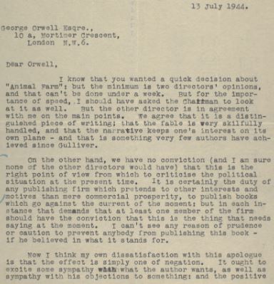Animal Farm was completed in 1944 and Orwell struggled to find a publisher. The manuscript was rejected by T.S. Eliot when he was at Farber and Farber.