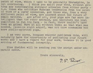 Ah, the ignorance of a poet! Eliot could not recognize evil. For Eliot, I suspect his position was in fact reasoned and based on a critical evaluation of Orwell’s literary construction, but the realpolitik of 1944 wouldn’t abide the negation of an ally. The US and British used Stalin to help defeat Hitler, but the intellectuals were enamored of egalitarian idealism. This is a cautionary tale with currency on several levels – be wary of political expediency, Russian duplicity, and intellectuals who forget human nature!