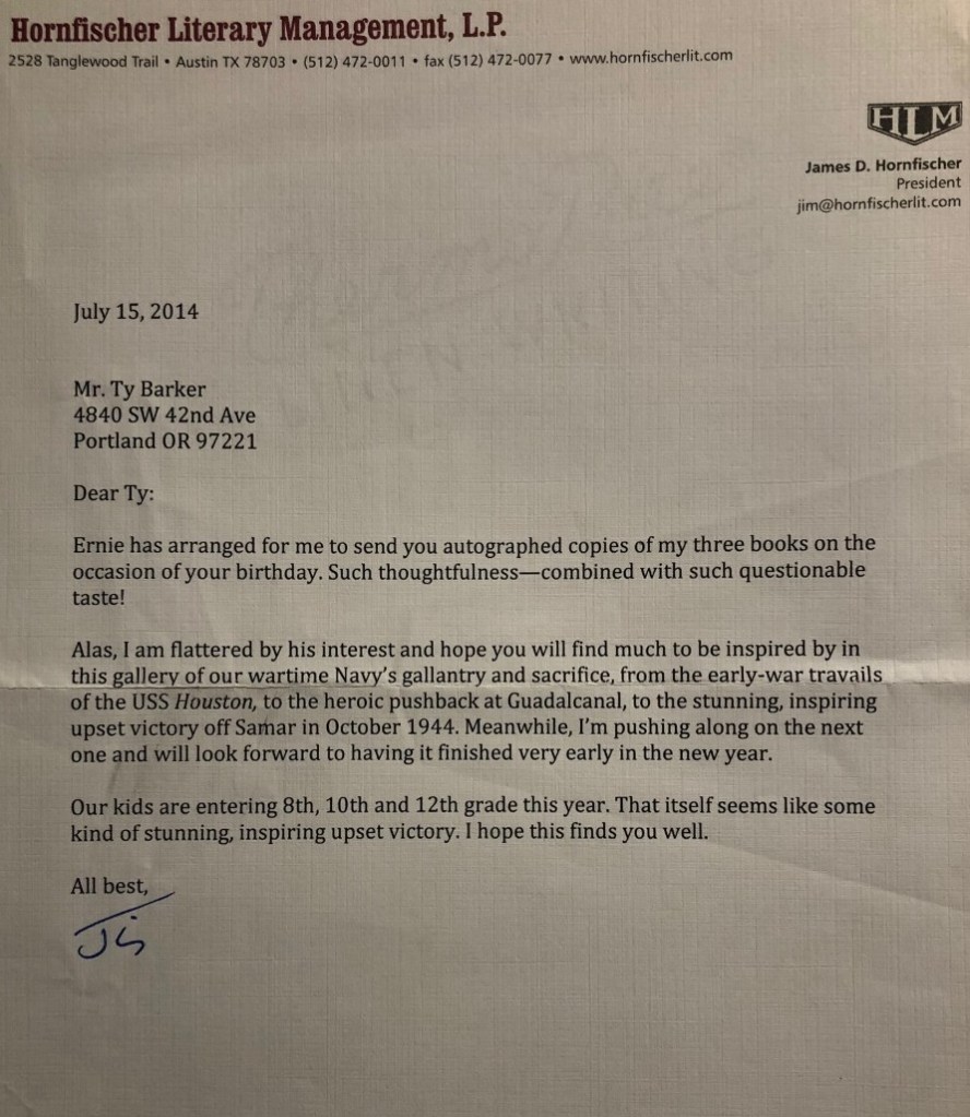 Through my father’s arrangements, I received autographed copies of his first three books (Ship of Ghosts, Neptune’s Inferno, and The Last Stand of the Tin Can Sailors) along with a gracious note from Jim.