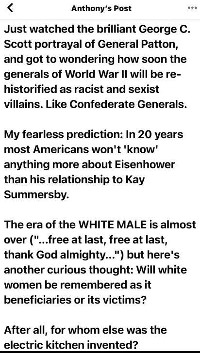 His bitter irony is more pronounced now: he has the freedom to speak truth because there are no consequences he fears. And the truth he points to is the fallacy of judging the past with the prejudices of the present. It is a high form of arrogance that presumes not only that the current norms are somehow in fact “better” but also presupposes an understanding of the conditions of the past. A double fallacy. Simply stated, Patton is too important to let current pathological concerns diminish his accomplishments and merits.