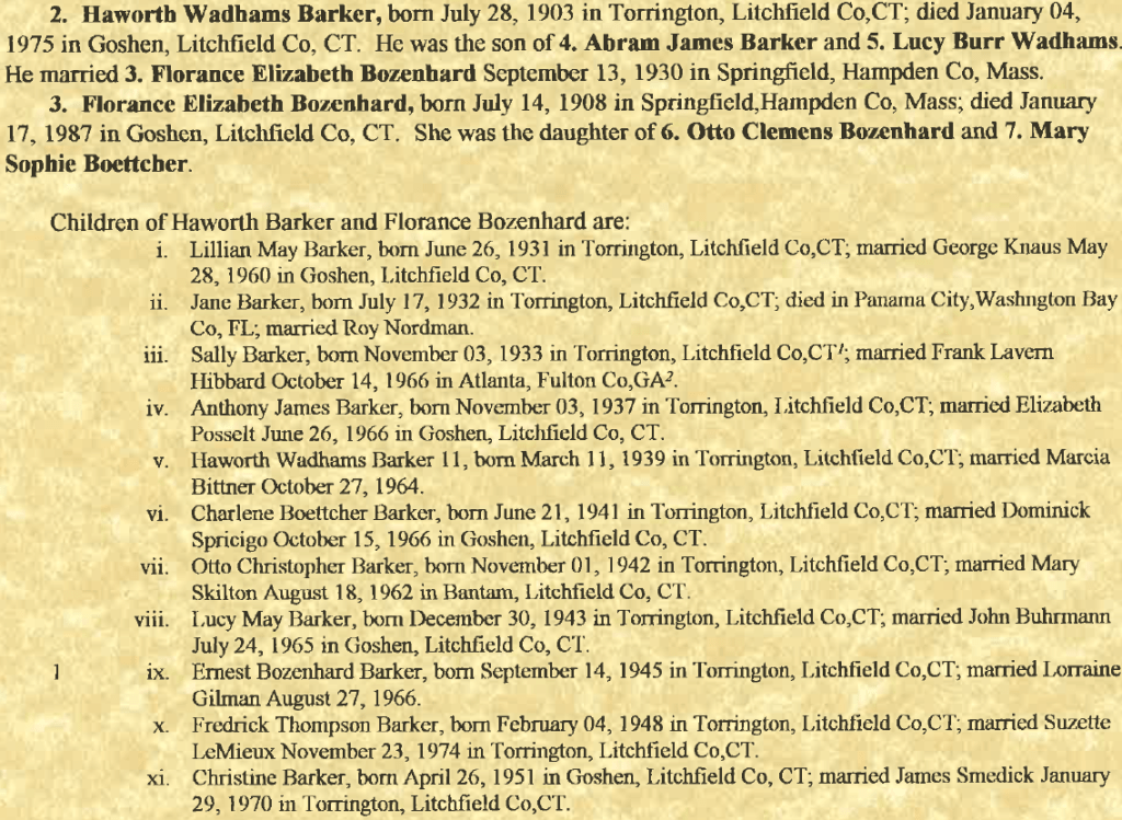 On my father’s side the Barker–Bozenhard–Wadhams line threads through Goshen, Connecticut, the Wadhams being both more prestigious and better chronicled. The men of that family helped build Goshen’s civic and agrarian foundations; their names cling to deeds and stone walls.