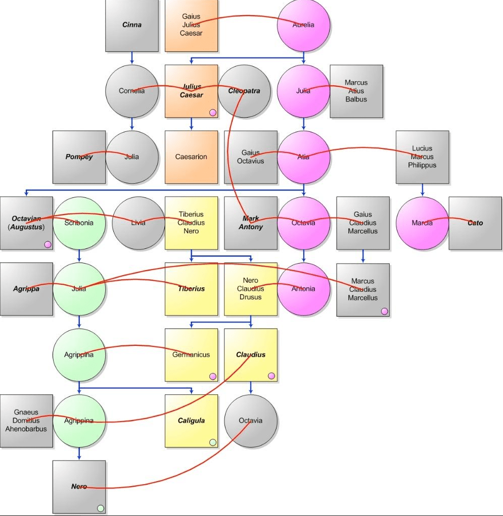 DNA of the Early Roman Emperors and Famous Associates: Squares are males. Disks are females. Blue arrows show direction of descent. Horizontal blue bars bind siblings. Red curves join “spouses,” that is, procreative couples. In cases of multiple spouses, the child goes with the most tightly bound spouse. Yellow squares represent one strain of Y-chromosome DNA (YDNA) passed down via males only; orange another. Magenta disks represent one strain of mitochondrial DNA (mtDNA) passed down via females only; green another. Small disks within squares are males carrying the designated mtDNA, who could not, being male, pass it on. The result is a predominance of the mtDNA lines over the YDNA – that is, of the feminine connections over the masculine.