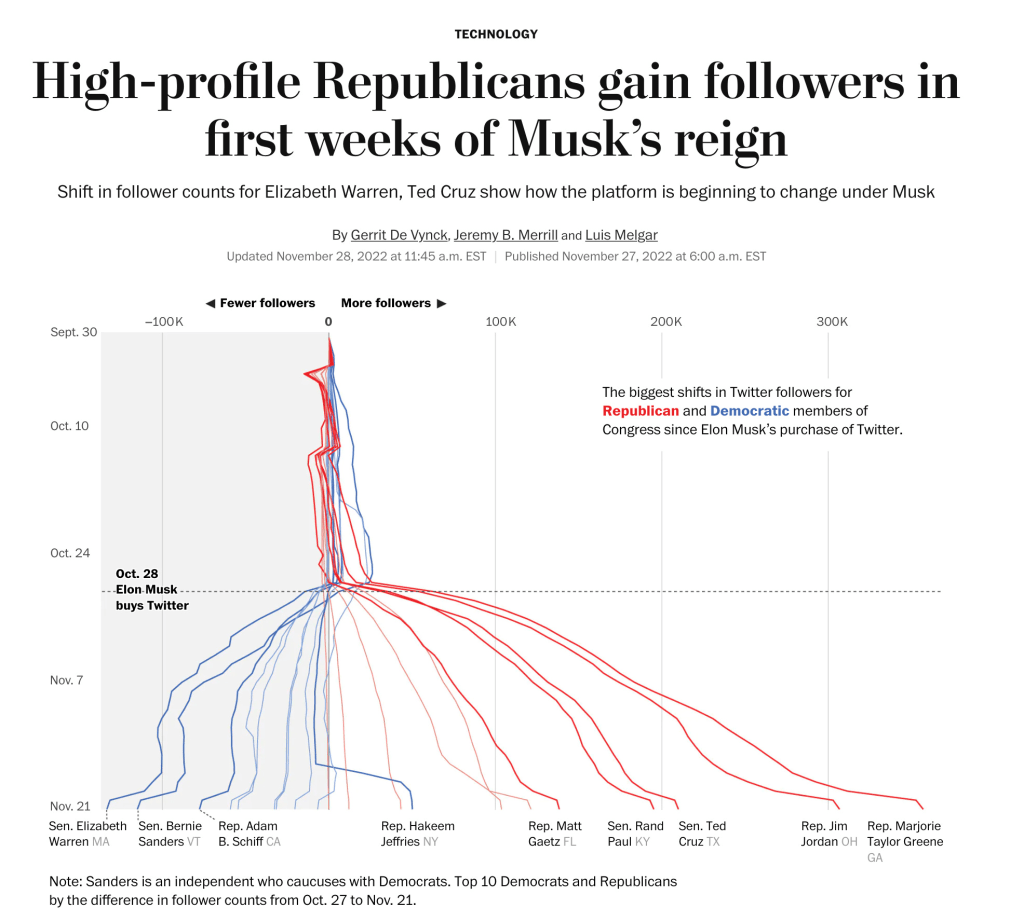 Update 11.21.22 – Since Elon Musk took over Twitter, Republicans have been gaining followers and Democrats losing them. Why? I am confused by the behavioral changes given an ownership change. Selective algorithms or self-fulfilling prophecy based on user bias?