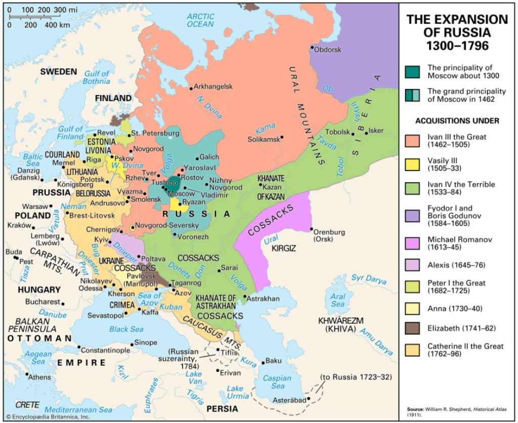 Under Empresses Elizabeth (1741-61) and Catherine the Great (1762-96), this centralization continued. They expanded the empire, taking territory from the Ottomans, Poland-Lithuania, and the Crimean Khanate (Riasanovsky & Steinberg, A History of Russia, 8th ed., 2011, pp. 243-258).