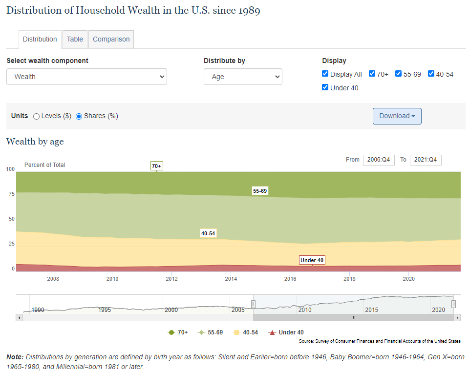 Discussions of “equality” and “equity” usually focus on income “distribution” and wealth outcomes. Especially in the United States, wealth is primarily “distributed” based on age cohorts.