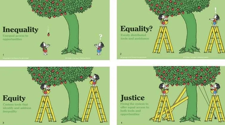 Equity is shown as if there is a deus ex machina providing ladders of differing but exactly the right height for each person to have equal access to the fruit. Who is this external agent providing perfectly sized ladders? How did they know the need existed, how were they produced, paid for, and distributed? The actual lesson is that differences in original conditions dictate that individuals must exhibit initiative to solve for scarce resources.