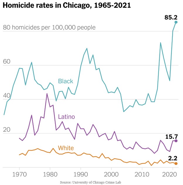 | This is what daily life looks like for many Black Chicagoans. Across the city, the murder rate for Black people is higher than it was from the 1980s through the 1990s — a violent period that drove a nationwide push for mass incarceration. Black Chicagoans are nearly 40 times more likely to be shot to death than their white peers, according to an analysis by the University of Chicago Crime Lab. |