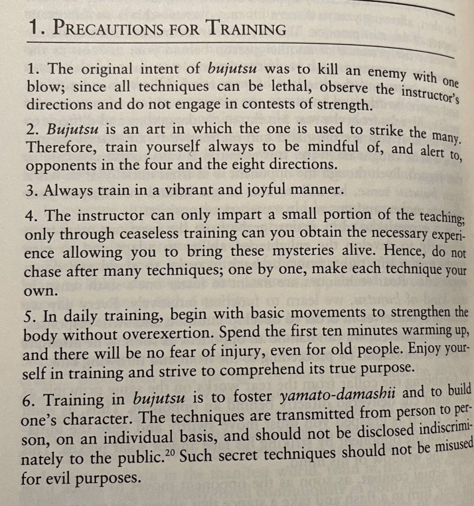 In Budo, Teachings of the Founder of Aikido (1991), O’Sensei outlined his “Precautions for Training.” This training manual was originally published (for private circulation) in 1938 when he was 55-years old.