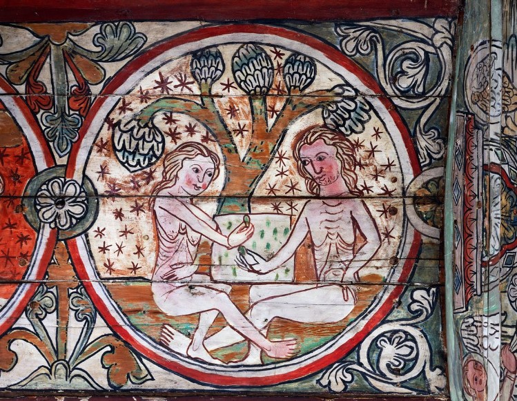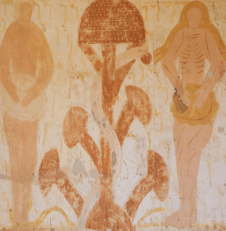 ADAM AND EVE STAND IN the Garden of Eden, both of them faceless. Eve’s ribs are bold slash marks, as if the artist wanted her to appear almost skeletal. But that is not the strangest thing about this faded 13th-century fresco inside France’s medieval Plaincourault Chapel. Between Adam and Eve stands a large red tree, crowned with a dotted, umbrella-like cap. The tree’s branches end in smaller caps, each with their own pattern of tiny white spots.