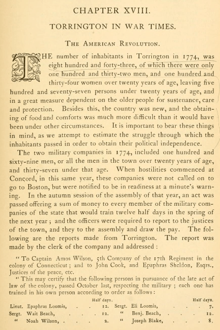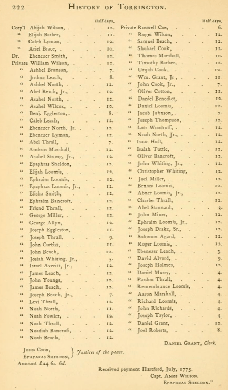 His mustering onto the roll is recorded as starting in 1774 in Rev. Samule Orcutt’s (1878) History of Torrington, Connecticut from Its First Settlement in 1737, with Biographies and Genealogies: