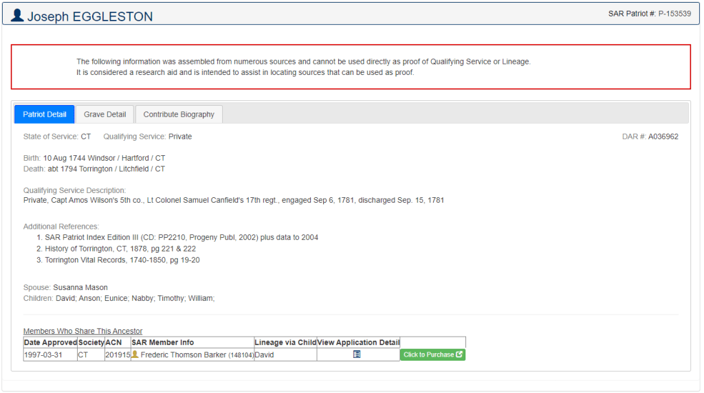 Using Joseph Eggleston as the ancestor was the path of least resistance – but additional ancestors also served. On my maternal side, both Caleb Taft (SAR Patriot #P-301378) and his nephew Bazaleel Taft (Bazaliel/Bezaleel SAR Patriot #P-301376) served.