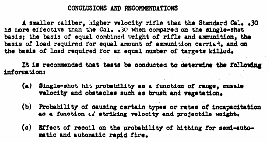 Aberdeen’s Ballistic Research Laboratory produced Donald L. Hall’s Ballistics Research Laboratory Memorandum No. 593 (1952) which reframed the problem in pragmatic terms. Hall modeled single-shot hit and kill probabilities across a family of rifles, explicitly holding total weight of rifle + ammunition as a constraint and asking which combination produced the greatest expected kills. Hall ran the weight math and produced the striking operational comparison. With the combined weight of gun and ammunition fixed at fifteen pounds, the expected number of kills for a cal. .21 rifle is approximately 2.5 times that of the standard cal. .30 rifle; and, with 96 rounds fixed, the cal. .21 system yields a 3.6-lb reduction in load (about 25% less) than the .30 system. Hall further calculated that to equal the expected number of kills produced by the 15-lb cal. .21 system, a soldier with a .30 M1 would have to carry an additional 10 lbs of ammunition (a total of ~25 lbs). Thus: