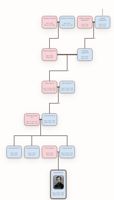 The connection appears to be valid – 4th cousins 6 times removed – to John Brown (1800–1859) and is best understood as a collateral kinship through the old Connecticut Eggleston network. The Eggleston lineage is documented in my SAR lineage descends from Revolutionary War patriot Joseph Eggleston and traces back into the early Windsor-area Eggleston families. John Brown’s direct Connecticut line intersects that same Eggleston family through Mary Eggleston (1702–1789), who married John Brown (1700–1790) and became the mother of Capt. John Brown (1728–1776), the abolitionist’s grandfather. The result is a credible explanation for the traditional association of being “a cousin of John Brown.”